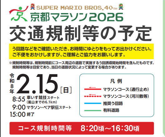 詳しくは、下記のリンク先:京都マラソン実行委員会発行のページをご覧ください。